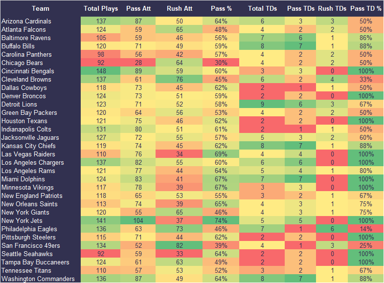 Who is running a lot of plays? Who is passing a lot or rushing a lot? Who is scoring a lot of touchdowns? Who is putting up yards? Who is getting red zone opportunities?