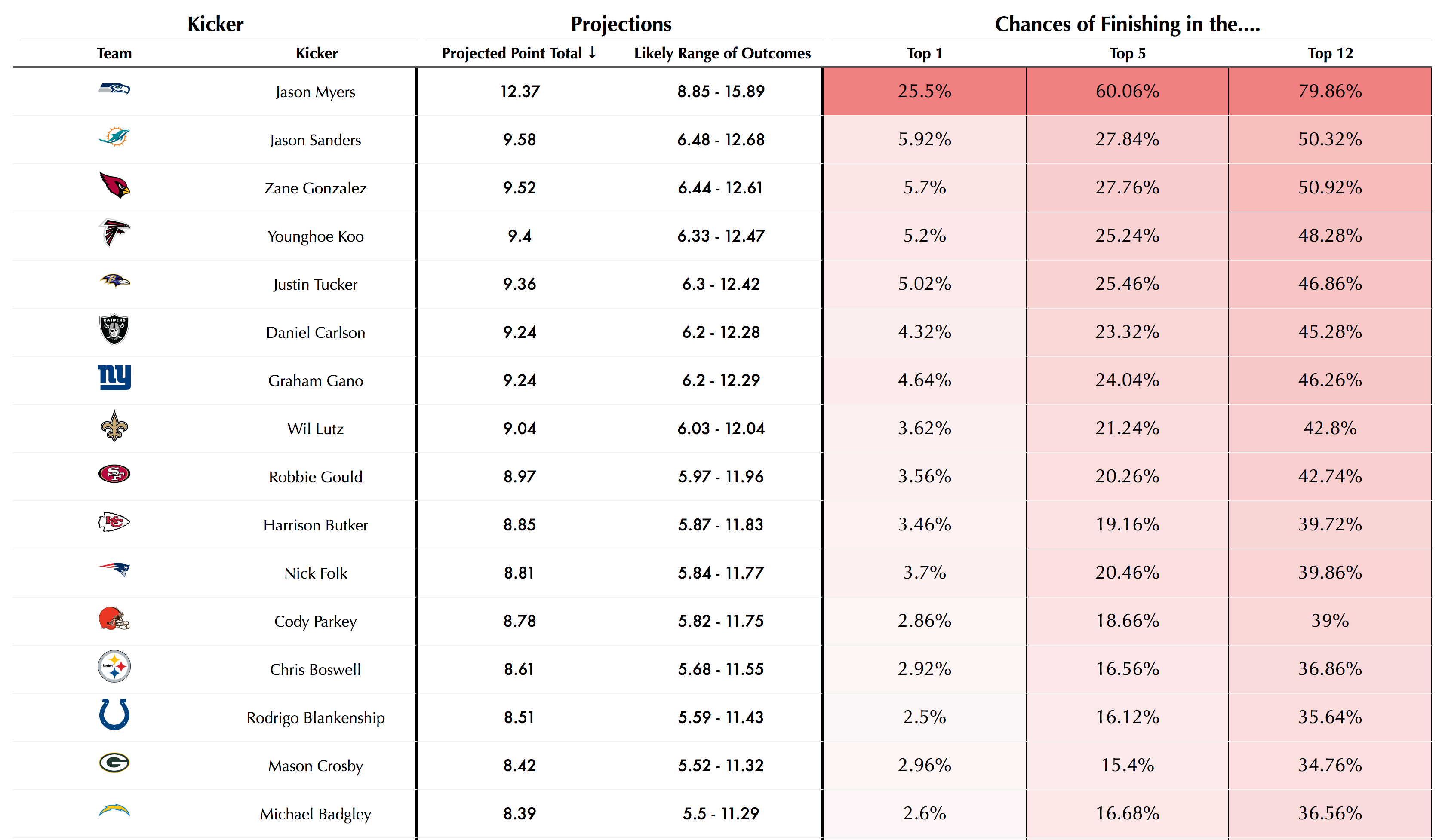 Using these projections, I ran 10000 simulations and reported the number of times each kicker finished in the top 12, top 5, and number one overall that week. Each week I’ll report the top 16 projected kickers along with a few notable exclusions outside the top 16 that you should avoid.