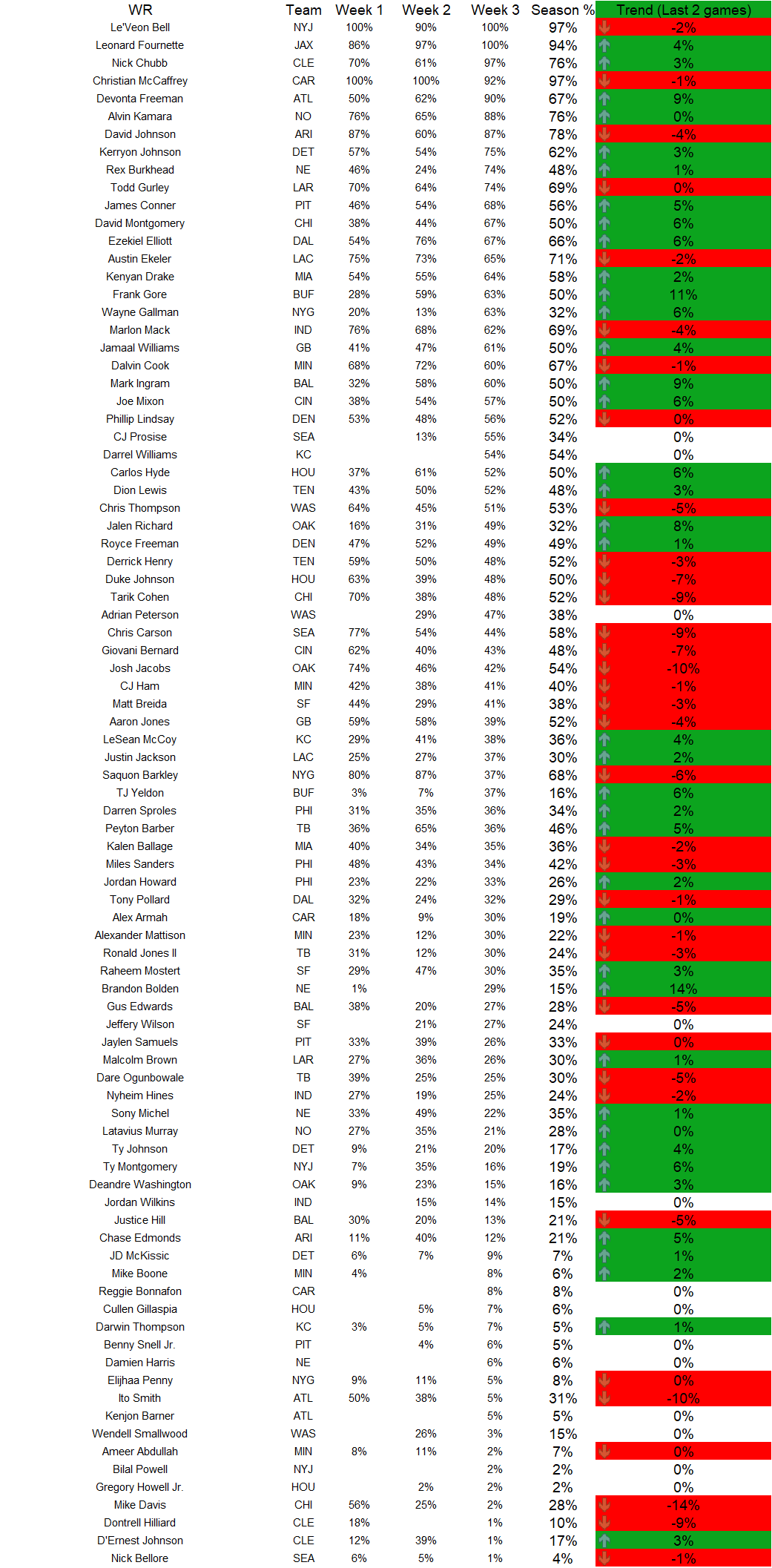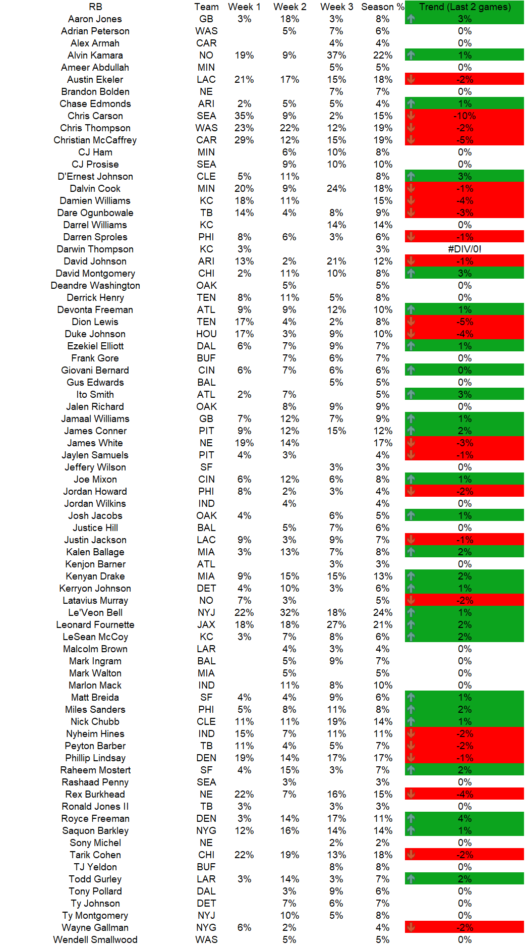 - Top-5 RBs in Target Share in Week 3: Alvin Kamara 37% Leonard Fournette 27% Dalvin Cook 24% Davis Johnson 21% James Conner/Nick Chubb 19%.