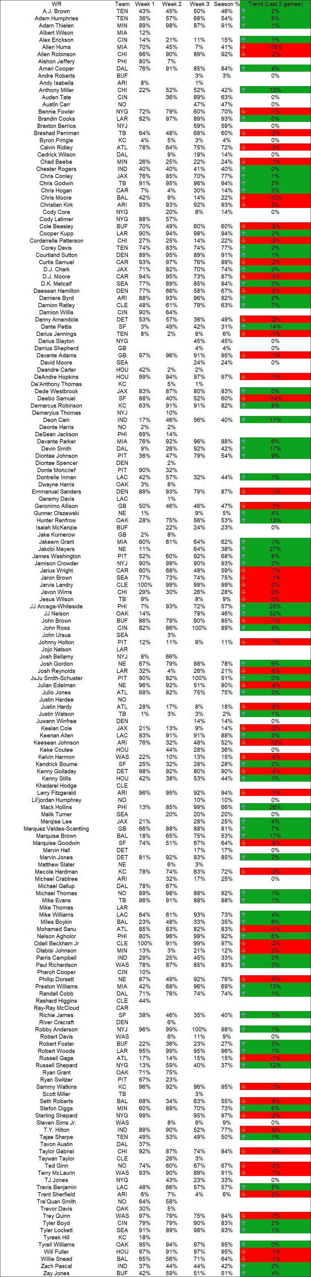 The tables below show a player’s share of their team’s snaps for each week as well as their season average and if they are trending upwards or downwards based on their two most recent games. A percentage above zero in the ‘Trends’ column indicates a player is trending upwards, while a percentage below zero means they are trending in the wrong direction. A trend of zero indicates they are playing on par with their season averages.