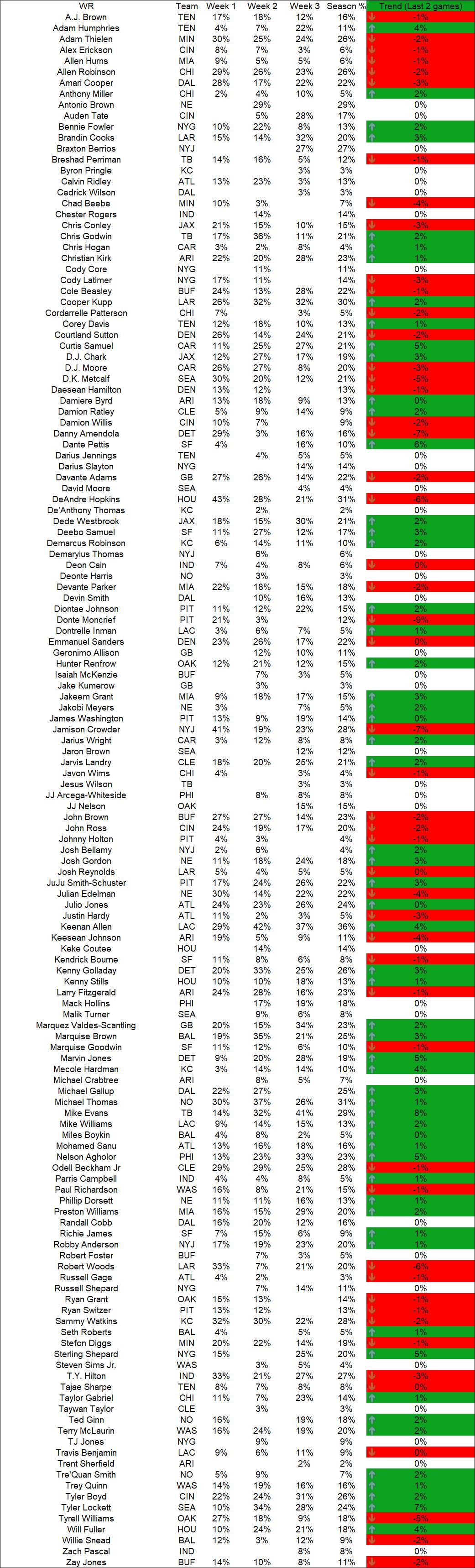 - Top-5 WRs in target share in Week 3: Mike Evans 41% Kennan Allen 37% MVS 34% Nelson Agholor 33% Brandin Cooks/Cooper Kupp 32%.