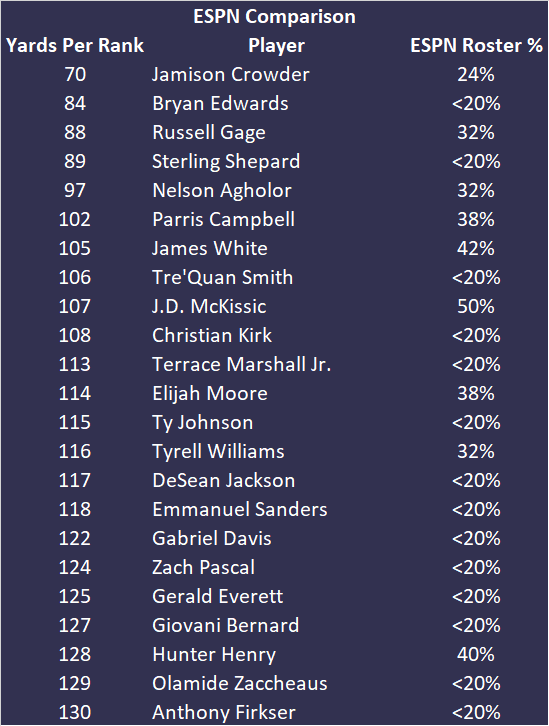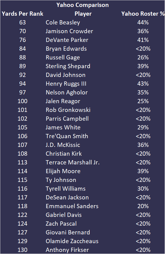 We’re looking at the top 130 players from the Yards Per Fantasy Weekly Rankings and highlighting all of the players who are less than 50-percent owned in your league. In other words, this is a list of the best players for this week who might be available in your league.