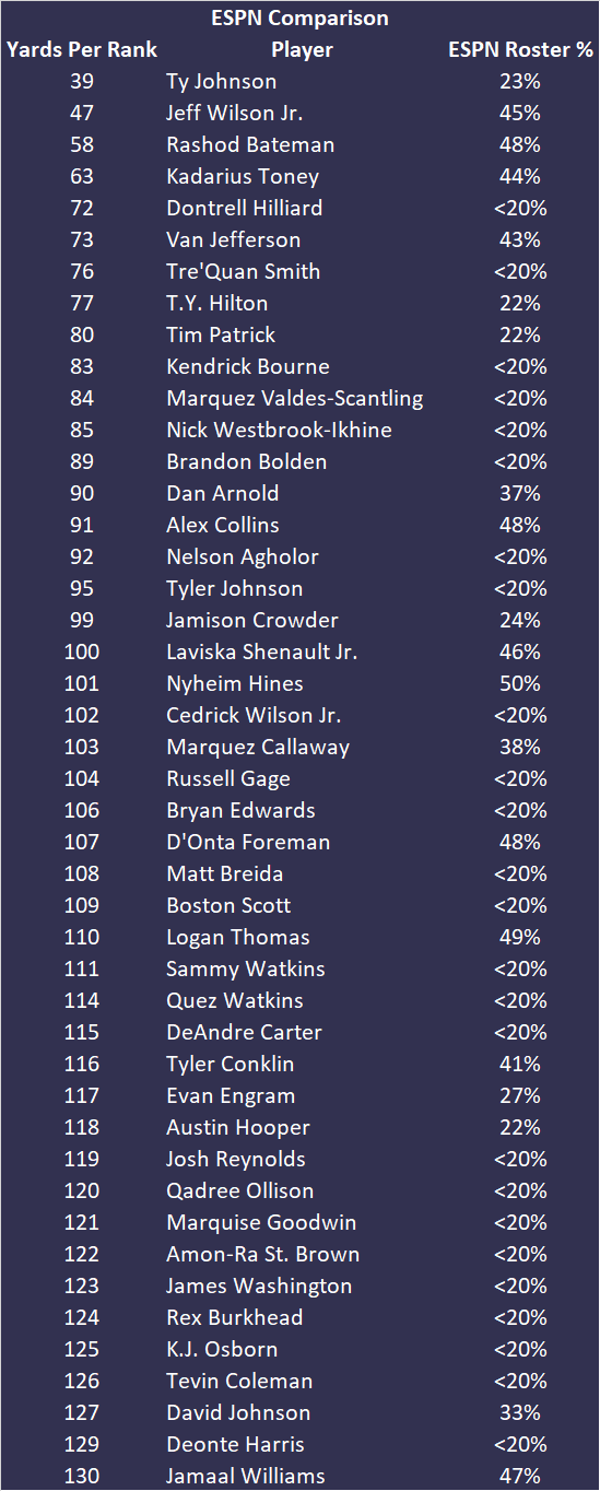 We’re looking at the top 130 players from the Yards Per Fantasy Weekly Rankings and highlighting all of the players who are less than 50-percent rostered in your league. In other words, this is a list of the best players for this week who might be available in your league.