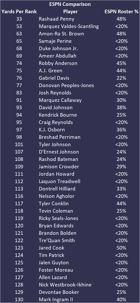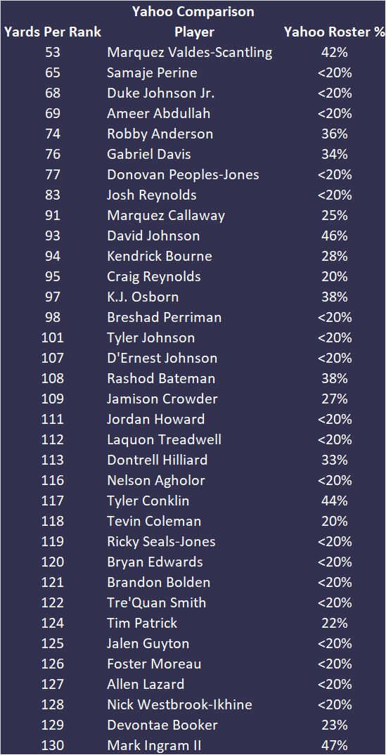 We’re looking at the top 130 players from the Yards Per Fantasy Weekly Rankings and highlighting all of the players who are less than 50-percent rostered in your league. In other words, this is a list of the best players for this week who might be available in your league.