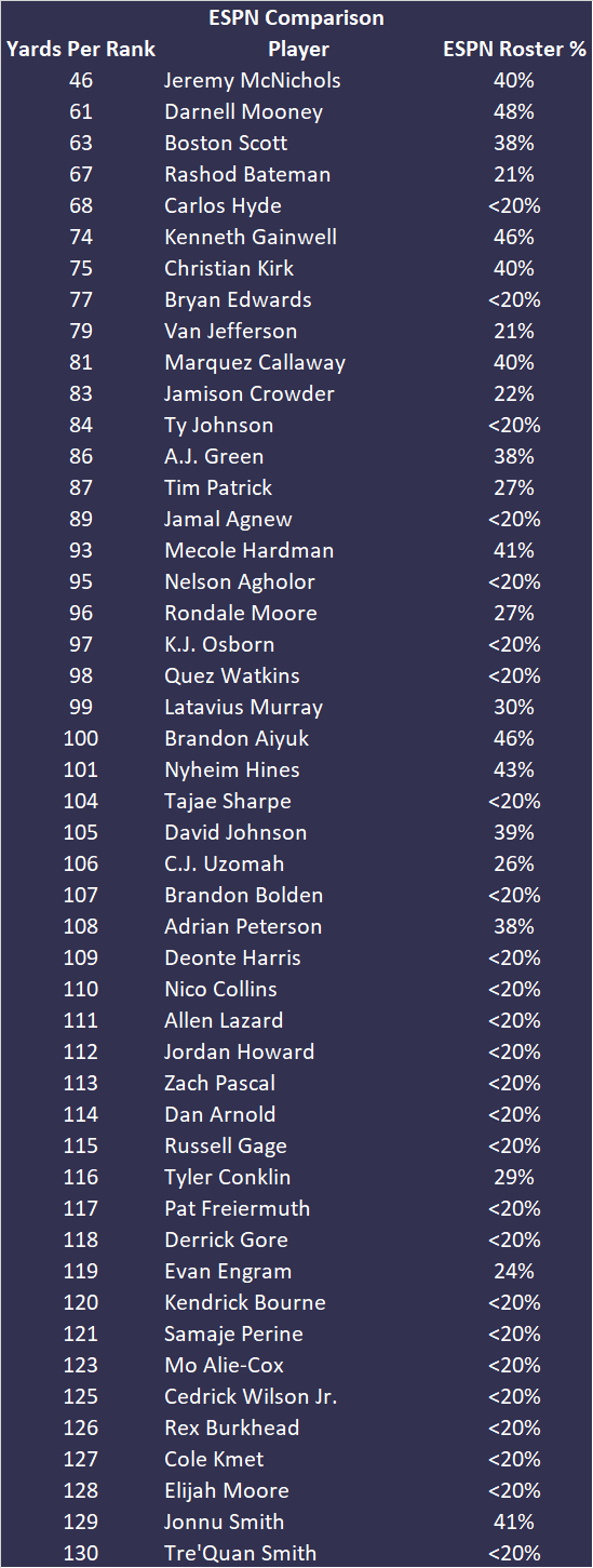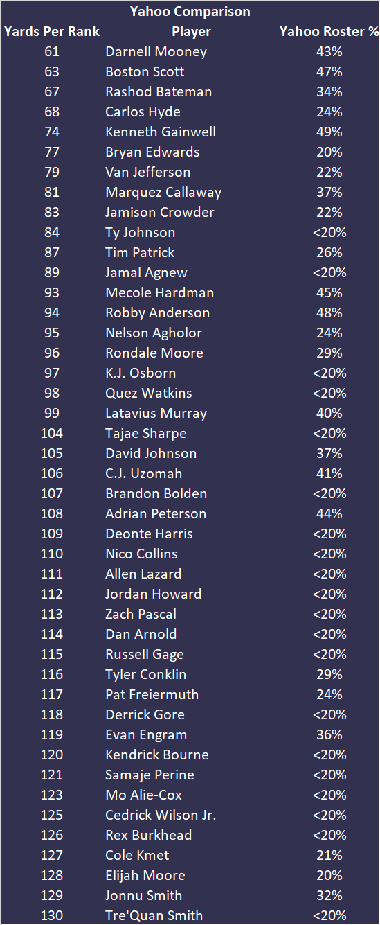 We’re looking at the top 130 players from the Yards Per Fantasy Weekly Rankings and highlighting all of the players who are less than 50-percent rostered in your league. In other words, this is a list of the best players for this week who might be available in your league.