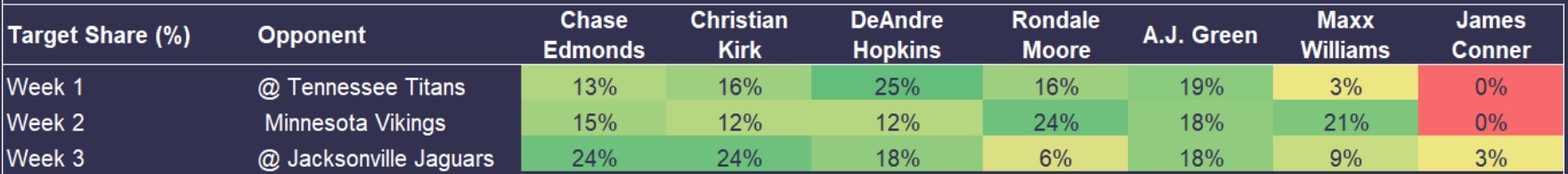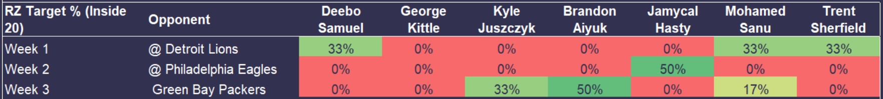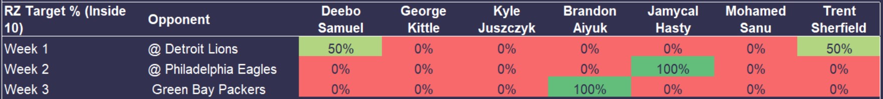 I’m not sure we know much about this team yet. After apparently being out of favour to start the season, Aiyuk has worked his way back to 50% of the redzone targets in week 3 and 100% of targets inside the 10 yard line.