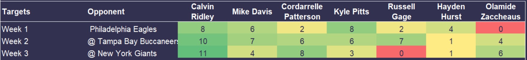 Ridley is still getting a solid target share but the aDOT has come right down. Outside of that, far too many targets to Cordarrelle Patterson with a less than stellar aDOT is pulling down the whole offense.