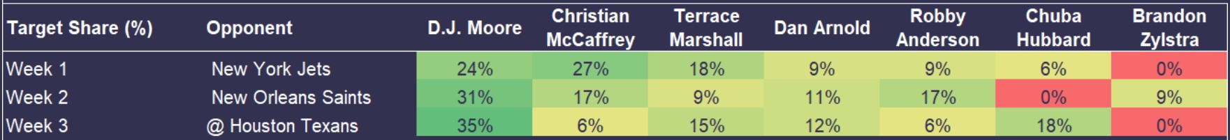 A definite shift from last season’s target spread to DJ Moore taking a more dominant share, along with a much less anti-social aDOT as Robby Anderson takes over as the deep threat.