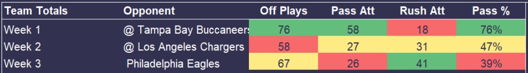 Game plan has been all over the map with total plays and pass/run splits. The 76-percent pass ratio in week 1 equalled their 2020 high and the 39-percent pass ratio in week 3 was lower than their 2020 low.