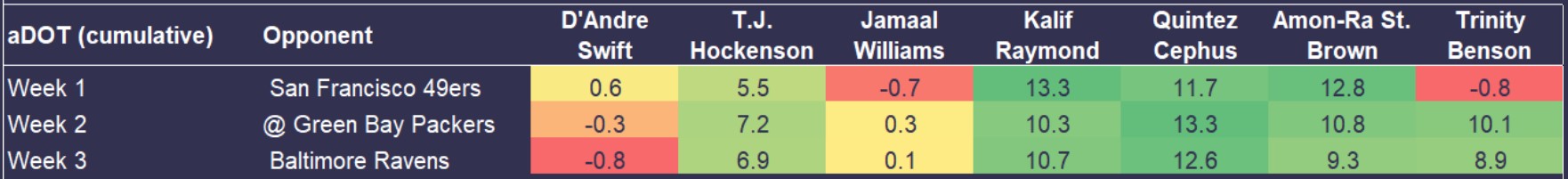 TJ Hockenson got the lowest target share of his NFL career to date in week 3 as Swift again took the Lion’s share (sorry, not sorry). He’s doing it all after the catch though, look at that aDOT!