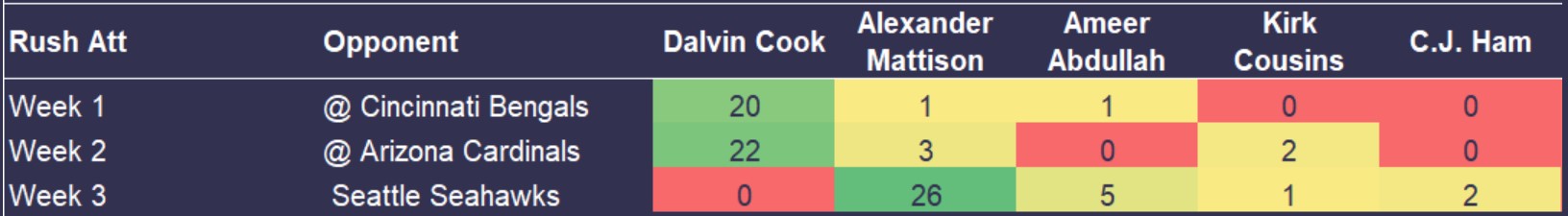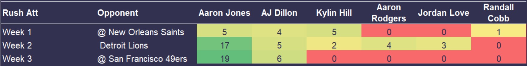 It’s Aaron Jones’ usage that I was most interested to see coming in to the season, with Jamaal Williams leaving and AJ Dillon potentially taking more touches. In the receiving game, Jones’ target share has actually gone down in 2 out of 3 games but his rush attempts have stayed exactly where they were last season (excluding that strange week one).