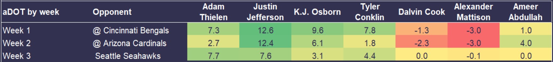 What’s interesting here is that Adam Thielen’s aDOT (average depth of target) has come down compared to last season. He’s now operating in the area of the field that Kyle Rudolph and Irv Smith were, while KJ Osborn is trotting a bit further afield instead.