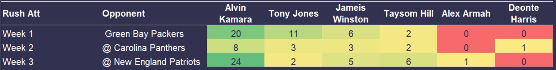 Alvin Kamara’s role has been much more of a traditional workhorse running back so far, with two games over 20 carries having only previously done that twice in his career before now.