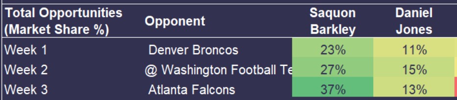 Daniel Jones is firmly one of those QBs who will take a 30% rush share each week but Saquon Barkley’s opportunity share is clearly increasing, a good sign with a potential for more opportunity from injuries to his teammates.