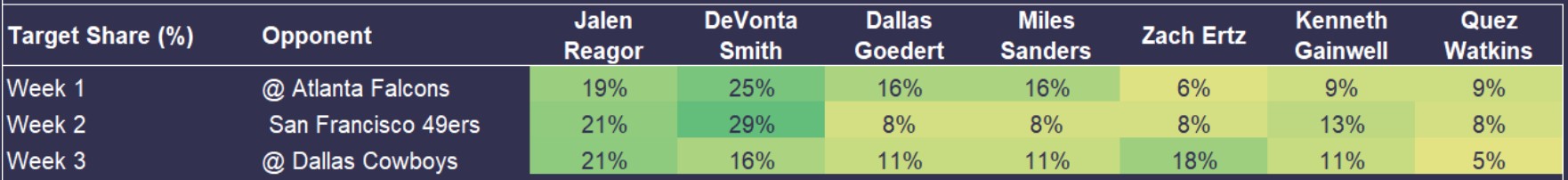 There’s nothing too exciting to pick out in Philadelphia. Smith was looking good out the gate but it’s evened out with Reagor and the Tight Ends (who also get those valuable redzone targets).