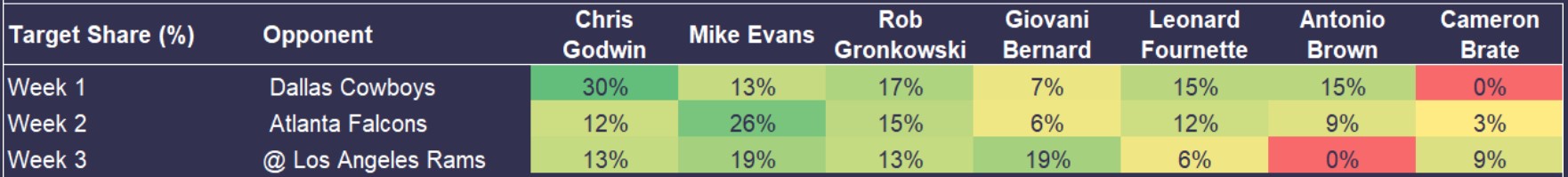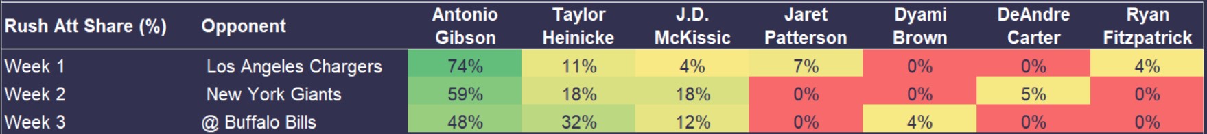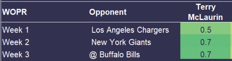 McLaurin’s WOPR (Weighted Opportunity) of 0.7 is exactly what we want to see from a top 12 Wide Receiver but Gibson’s declining rush share is not what we wanted from a top 12 Running Back.