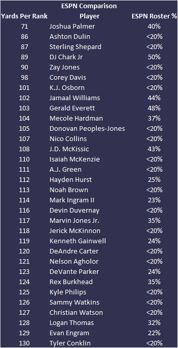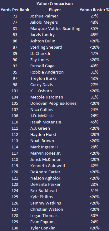 We’re looking at the top 130 players from the Yards Per Fantasy Weekly Rankings and highlighting all of the players who are less than 50-percent rostered in your league. In other words, this is a list of the best players for this week who might be available in your league.