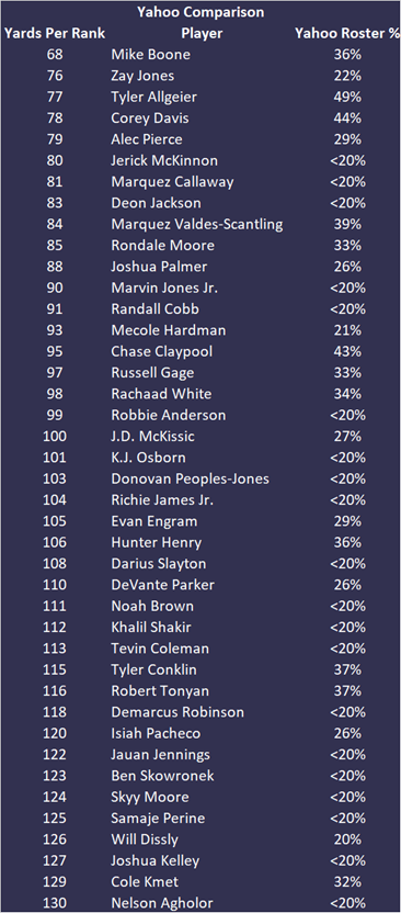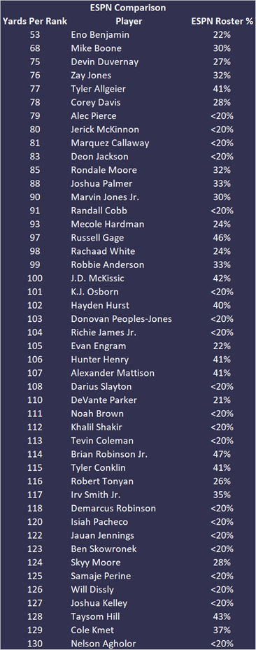 We’re looking at the top 130 players from the Yards Per Fantasy Weekly Rankings and highlighting all of the players who are less than 50-percent rostered in your league. In other words, this is a list of the best players for this week who might be available in your league.